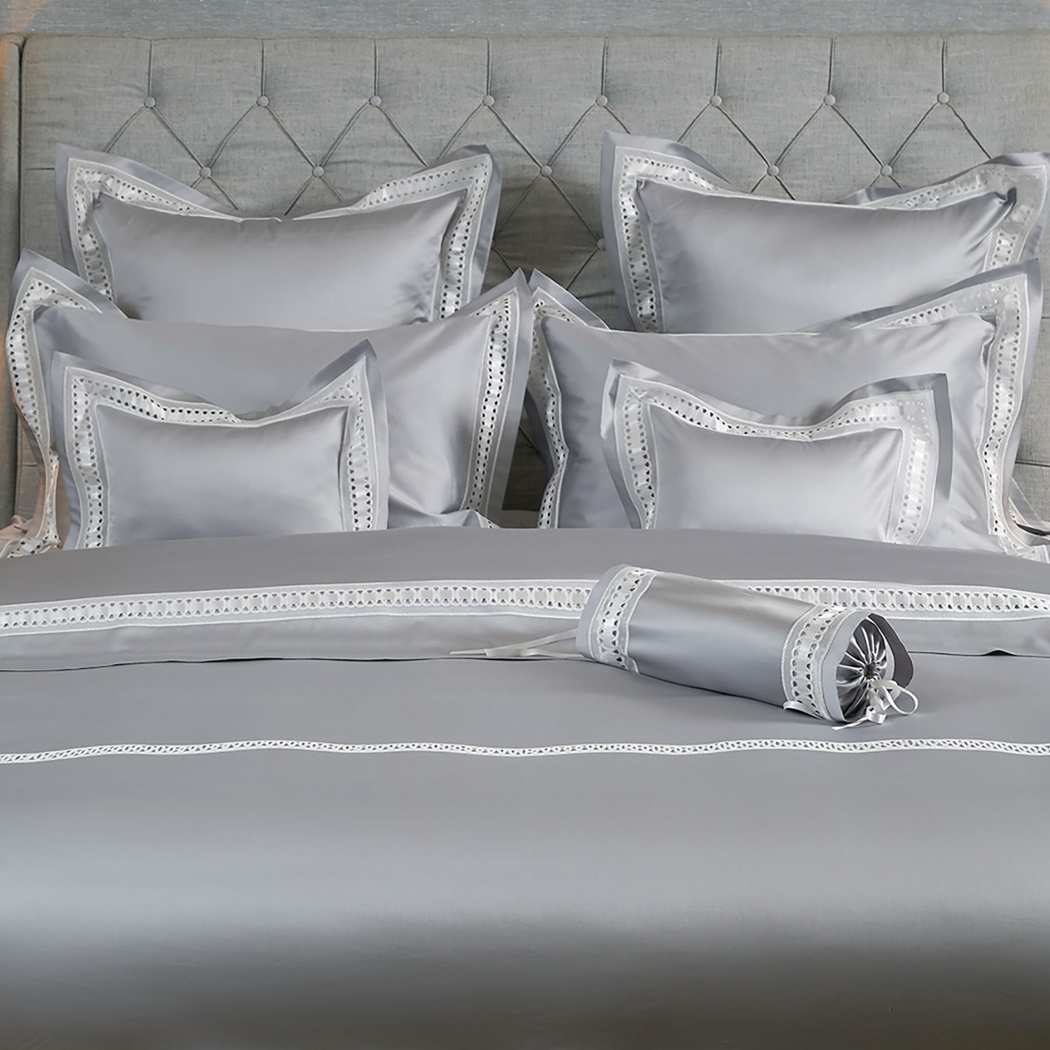 The DANZE collection brings sumptuous handmade lace into modern life. The exquisite Broderie anglaise lace is inlaid with a satin ribbon, a contemporary interpretation of antique lace trims of 19th century sleepwear. The intricate craftwork of the Italian lace is coupled with our ANGEL SKIN® 600 thread count GIZA Egyptian cotton sateen, creating a graceful and elegant addition to any decor.