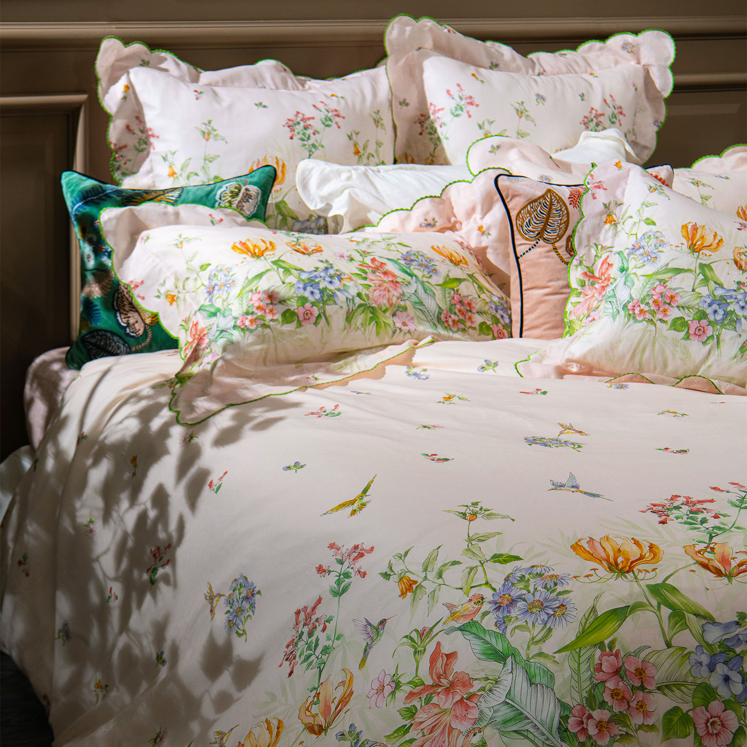 The GIARDINO collection is inspired by a summer garden, replete with blooming flowers and the delightful sounds of birdsong. Our ANGEL SKIN® voile, woven from fine GIZA Egyptian cotton, feels as light as air and displays a joyous garden print beautifully framed with an embroidered scalloped edge introducing sublime radiance to your home.