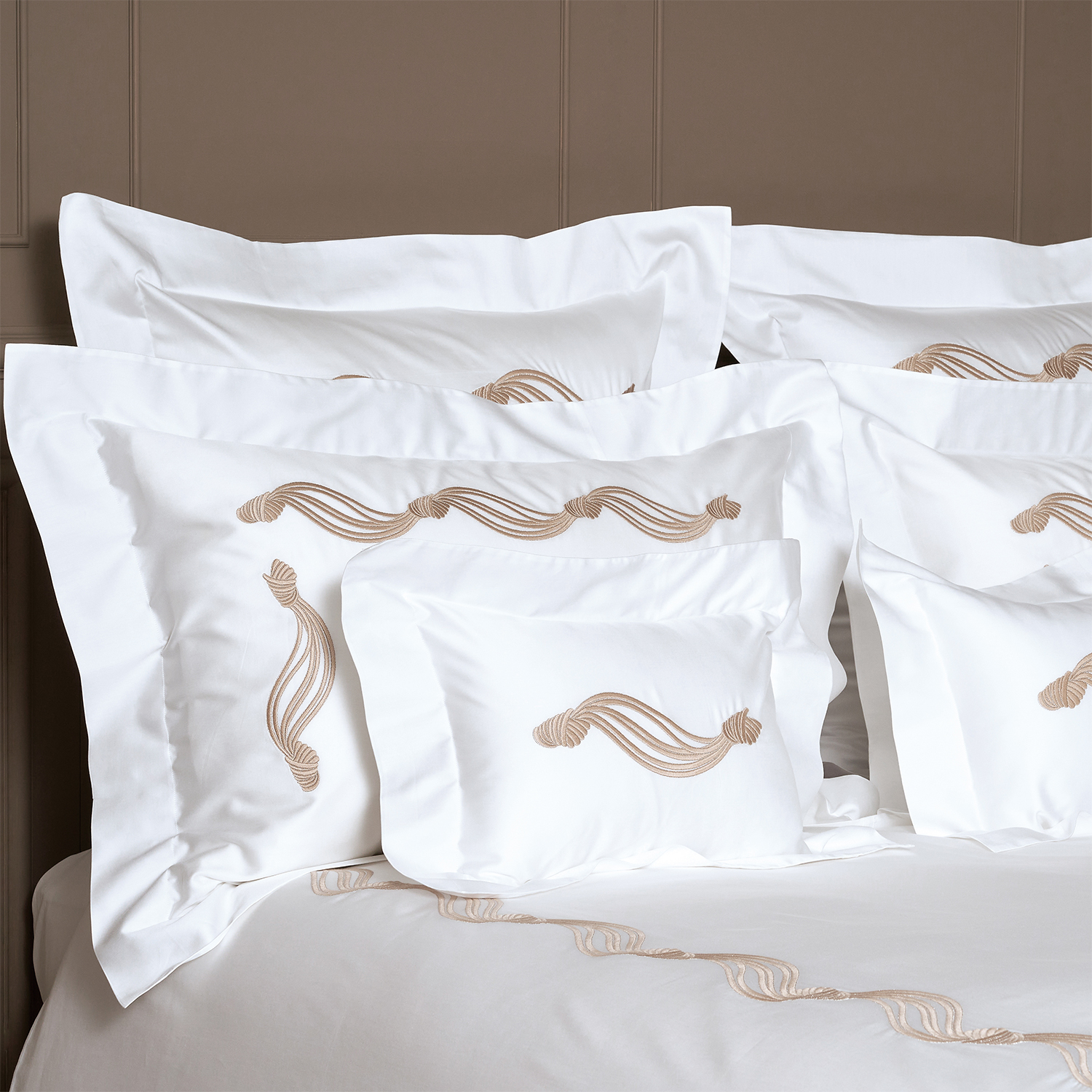 The GIOIELLO collection has been designed for those who enjoy the simplicity of minimalism, yet demand a sumptuous and chic aesthetic. With a two-toned embroidered noble knot motif on our GIZA Egyptian cotton sateen, the GIOIELLO collection brings a contemporary and elegant ambience to any home.