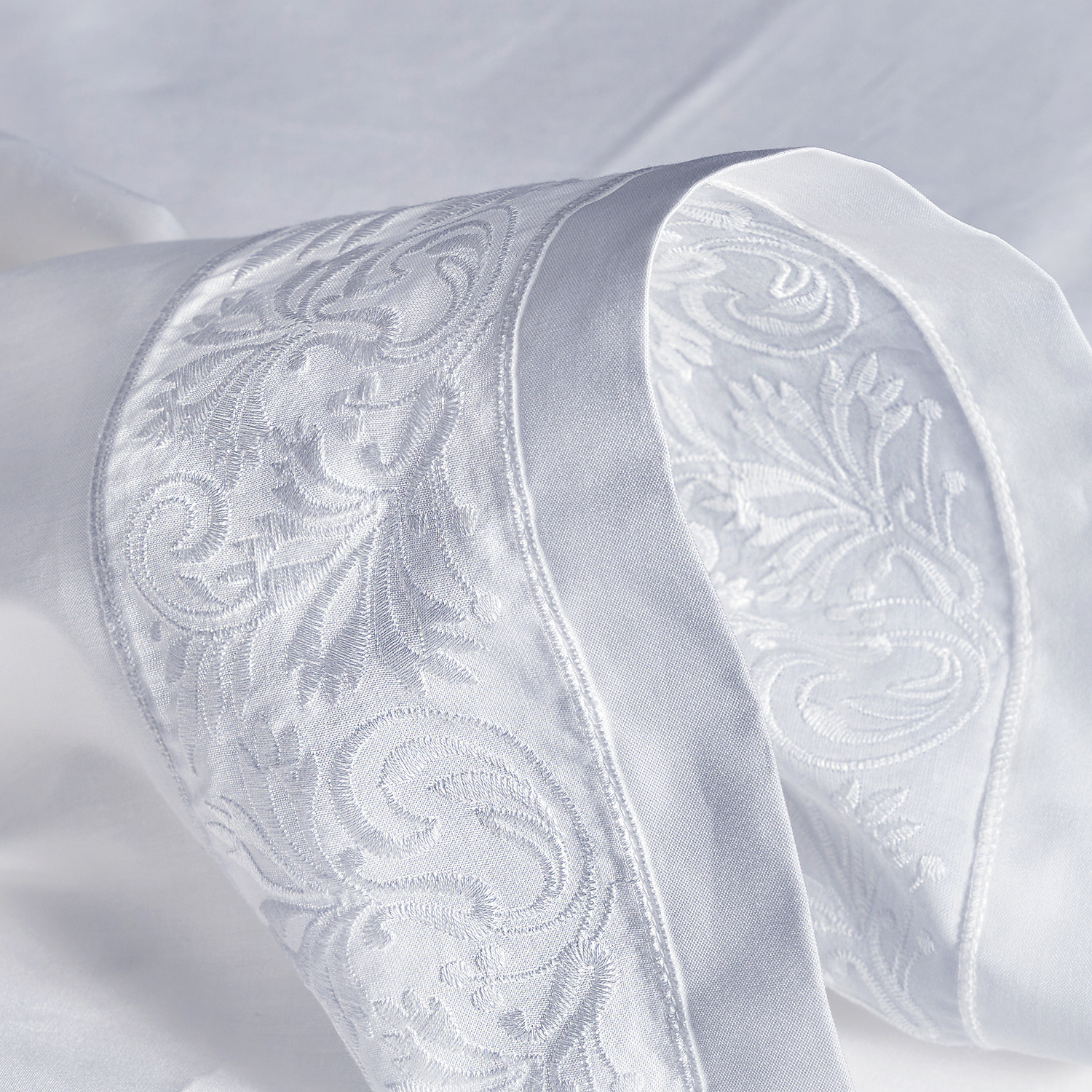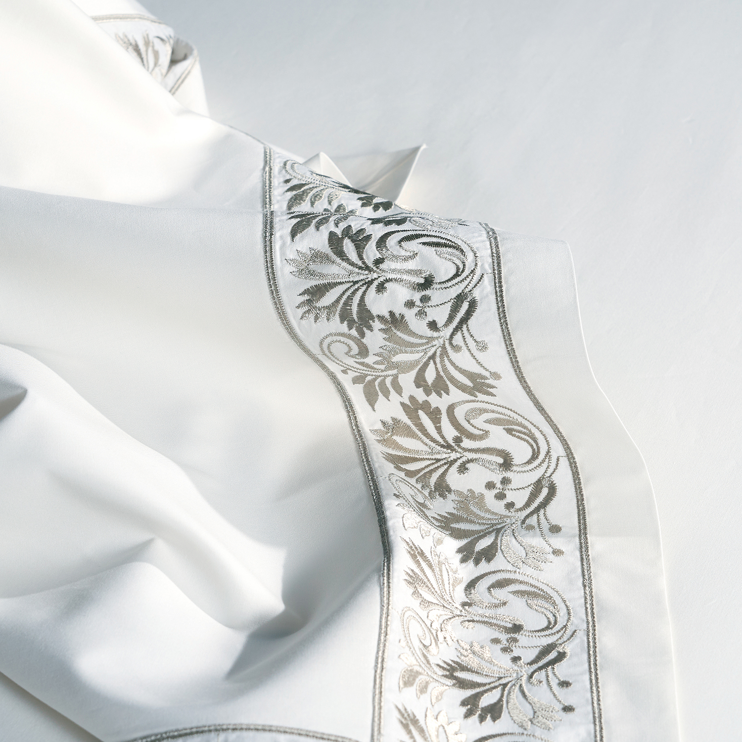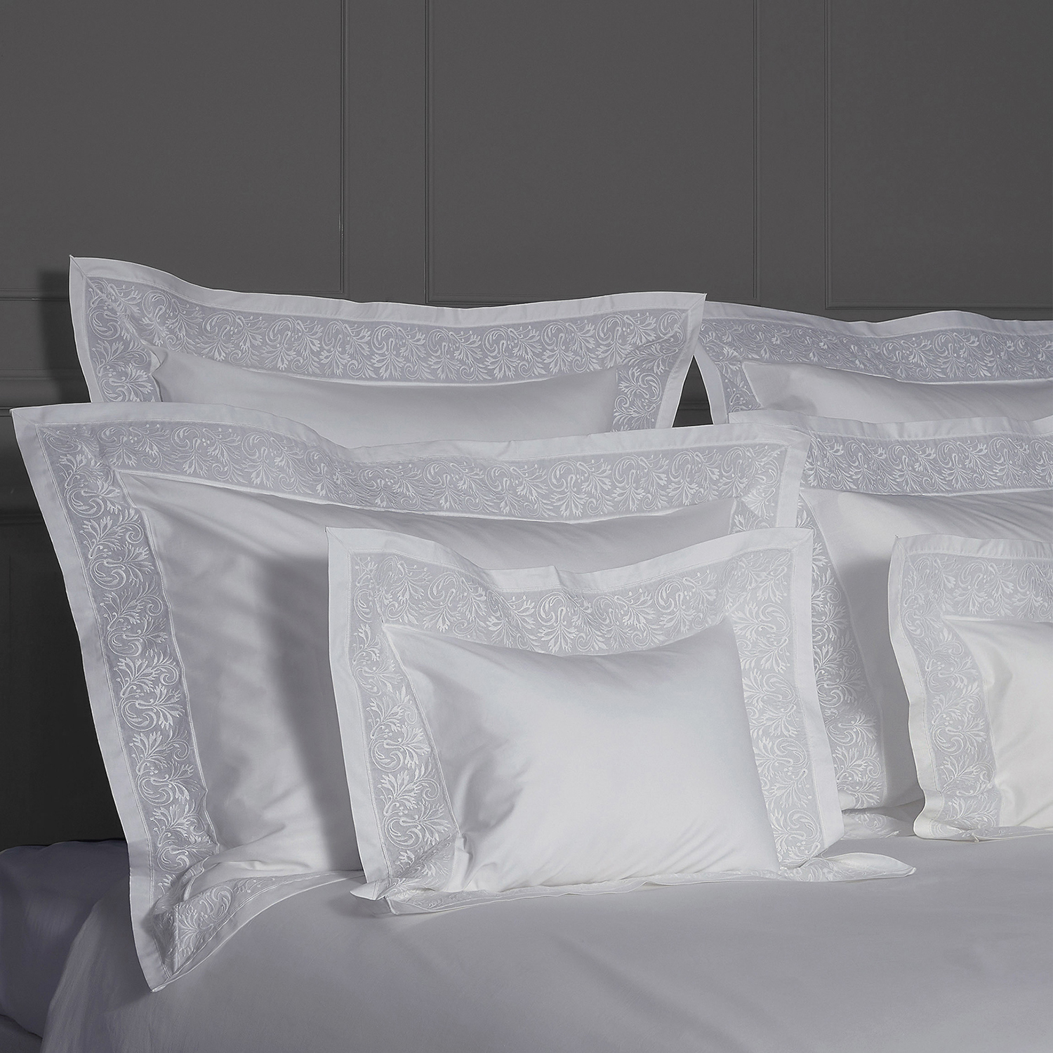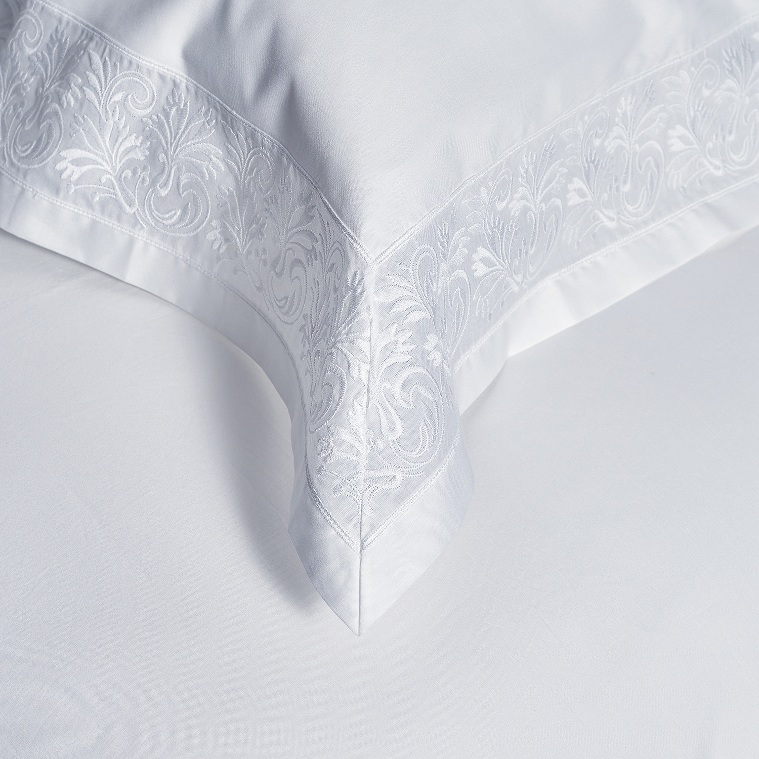 The EUTERPE collection features an exquisite lace decoration inspired by the “Rococo” artistic movement. Our exclusive lace design is embroidered onto a fine muslin base. The lace is then paired with our ANGEL SKIN®, GIZA Egyptian cotton percale to create a durable bed linen which is exceptionally breathable and soft to the touch.