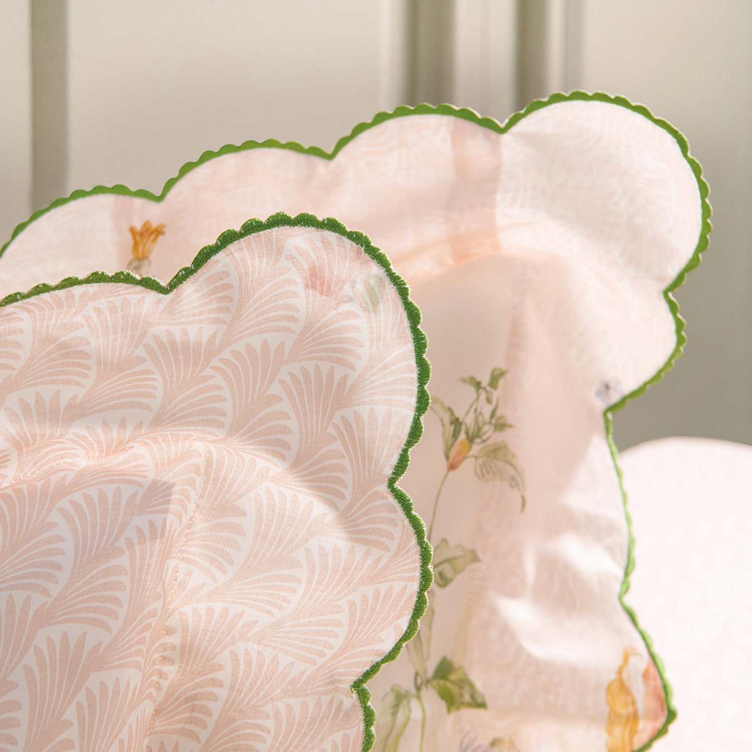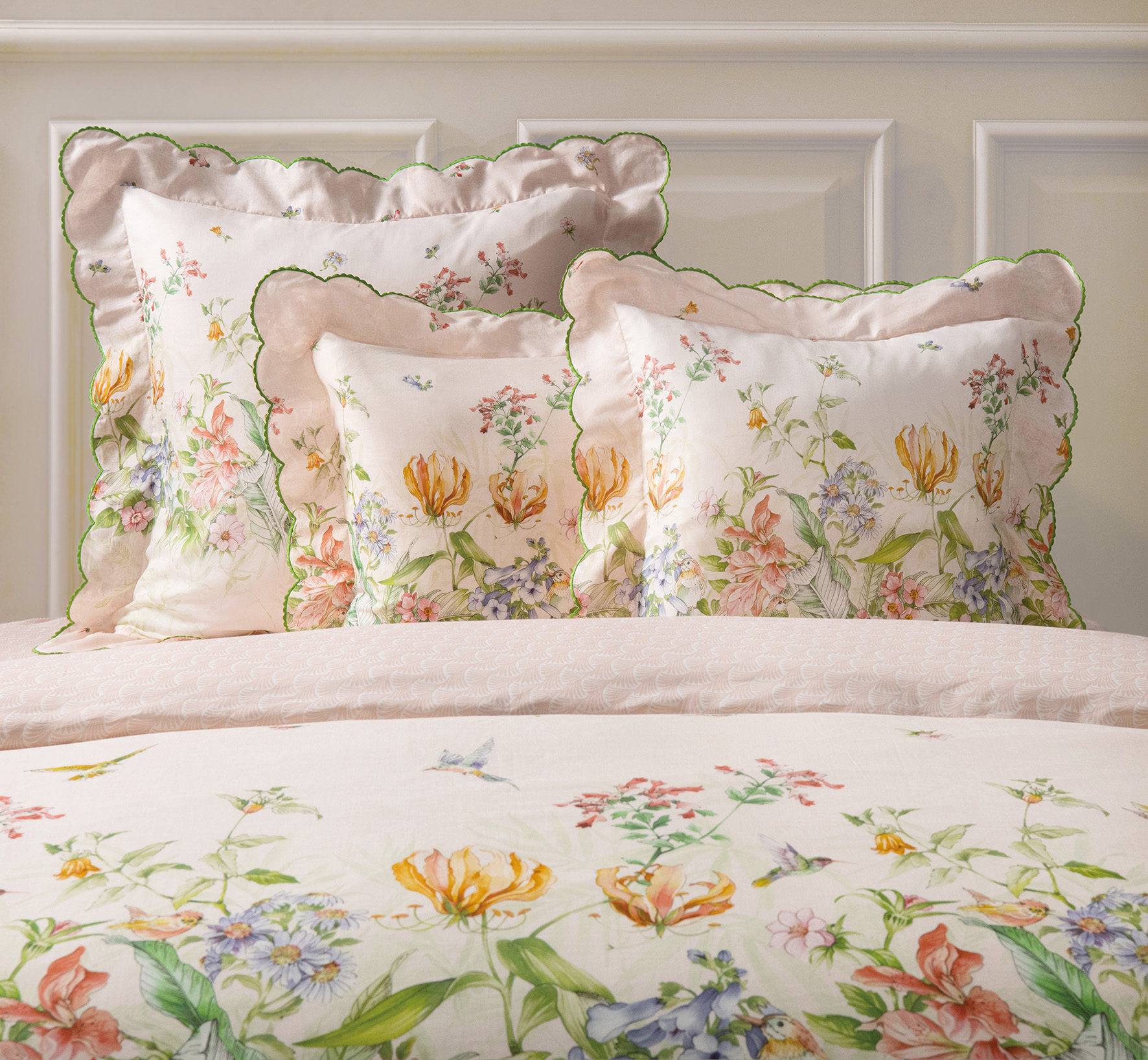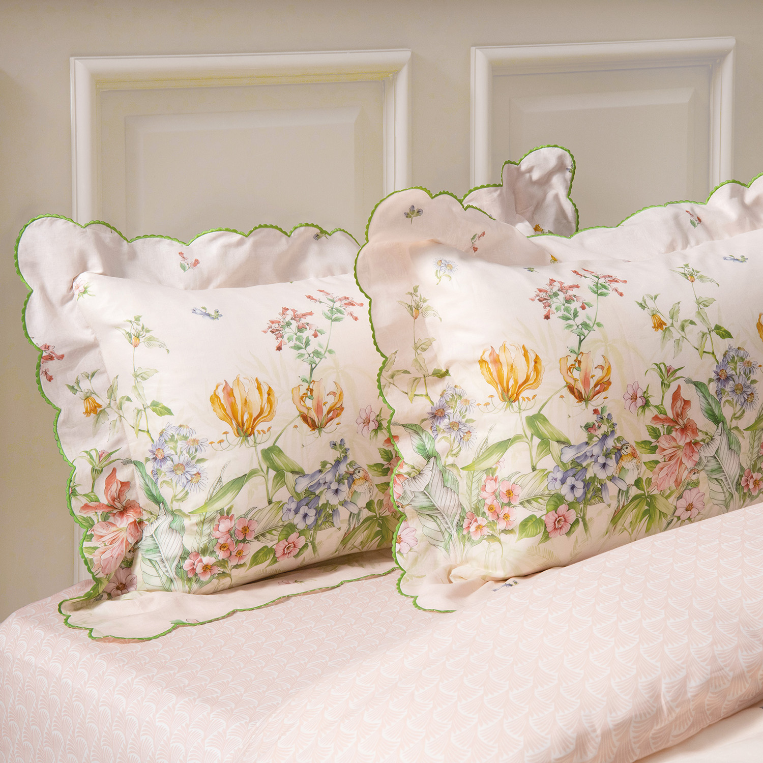 The GIARDINO collection is inspired by a summer garden, replete with blooming flowers and the delightful sounds of birdsong. Our ANGEL SKIN® voile, woven from fine GIZA Egyptian cotton, feels as light as air and displays a joyous garden print beautifully framed with an embroidered scalloped edge introducing sublime radiance to your home.