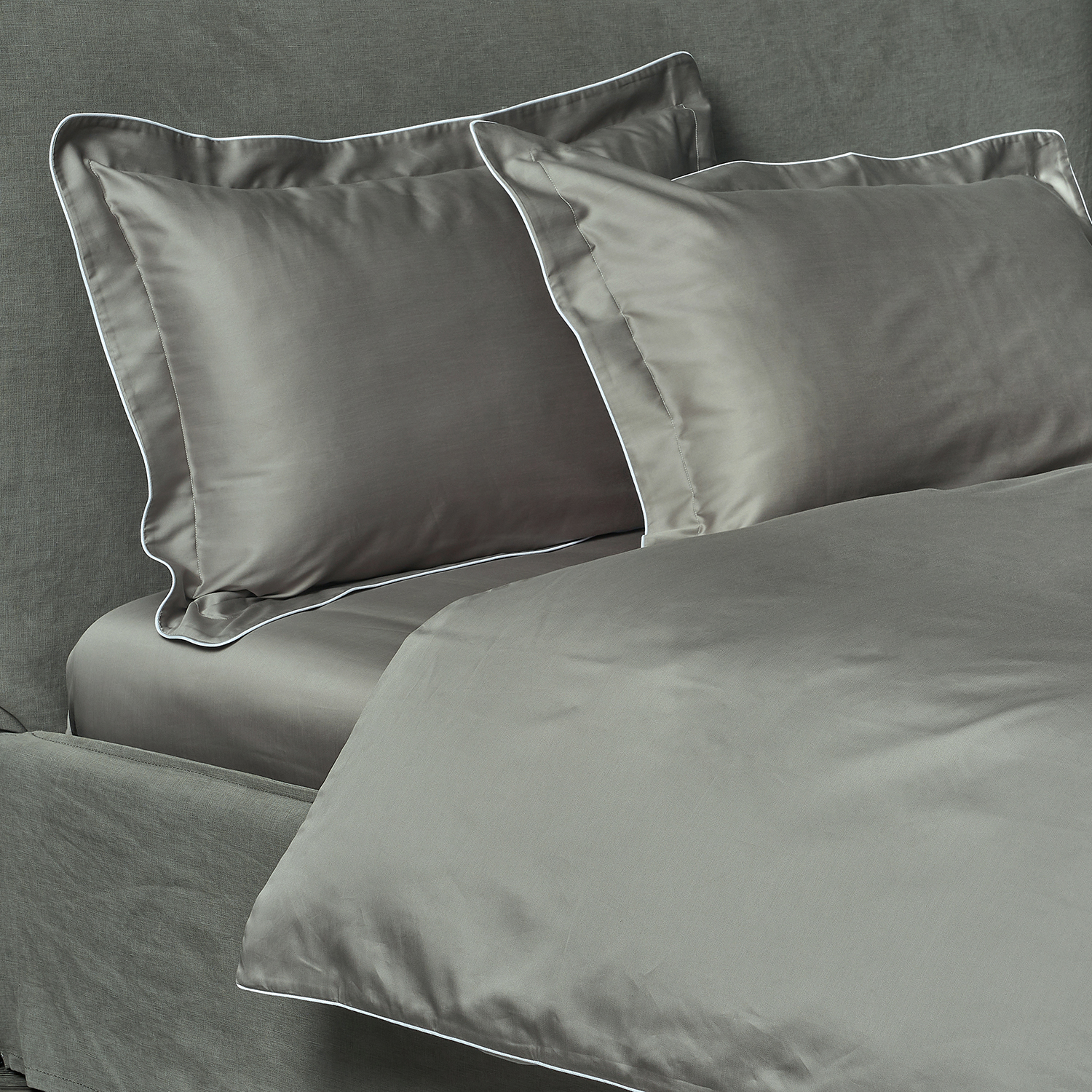 The IVAN collection features a solid color ANGEL SKIN® GIZA Egyptian cotton sateen complemented with delicate satin piping, as often used in fashion designers collections. The piping is crafted around the softly curved edges in a contrasting colorway bringing effortless refinement.