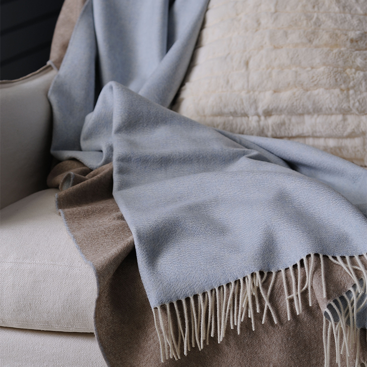 An exquisite throw with fringes, made with almost 15 km of prestigious cashmere wool yarn in the Italian town of Biella, world renowned for its centuries of workmanship with cashmere. The weave is enriched through teasing with natural thistles, which confer an elegant and sinuous look and requires more than ten different individual processes.