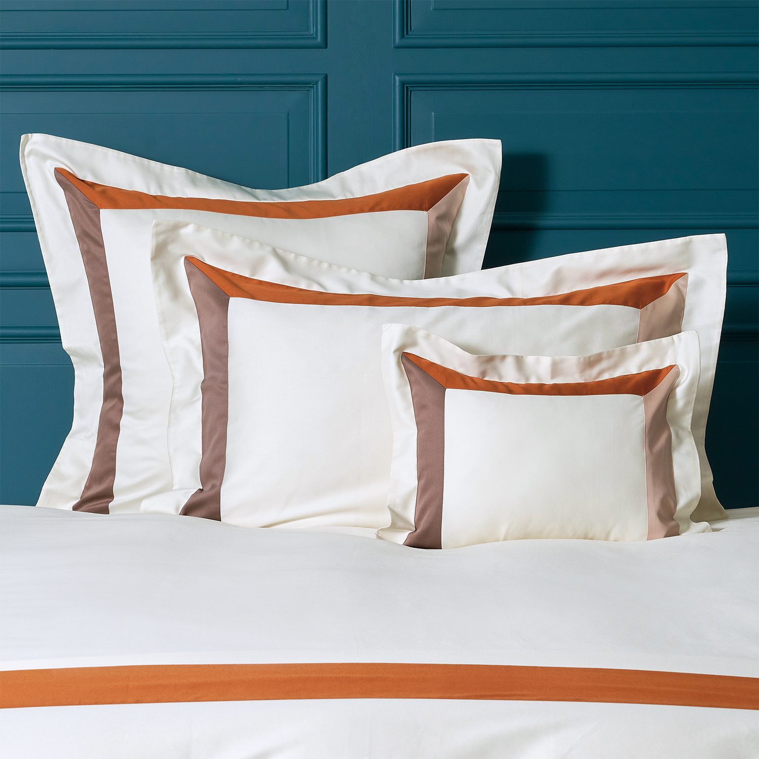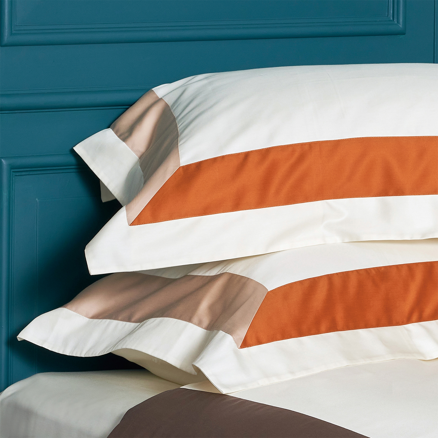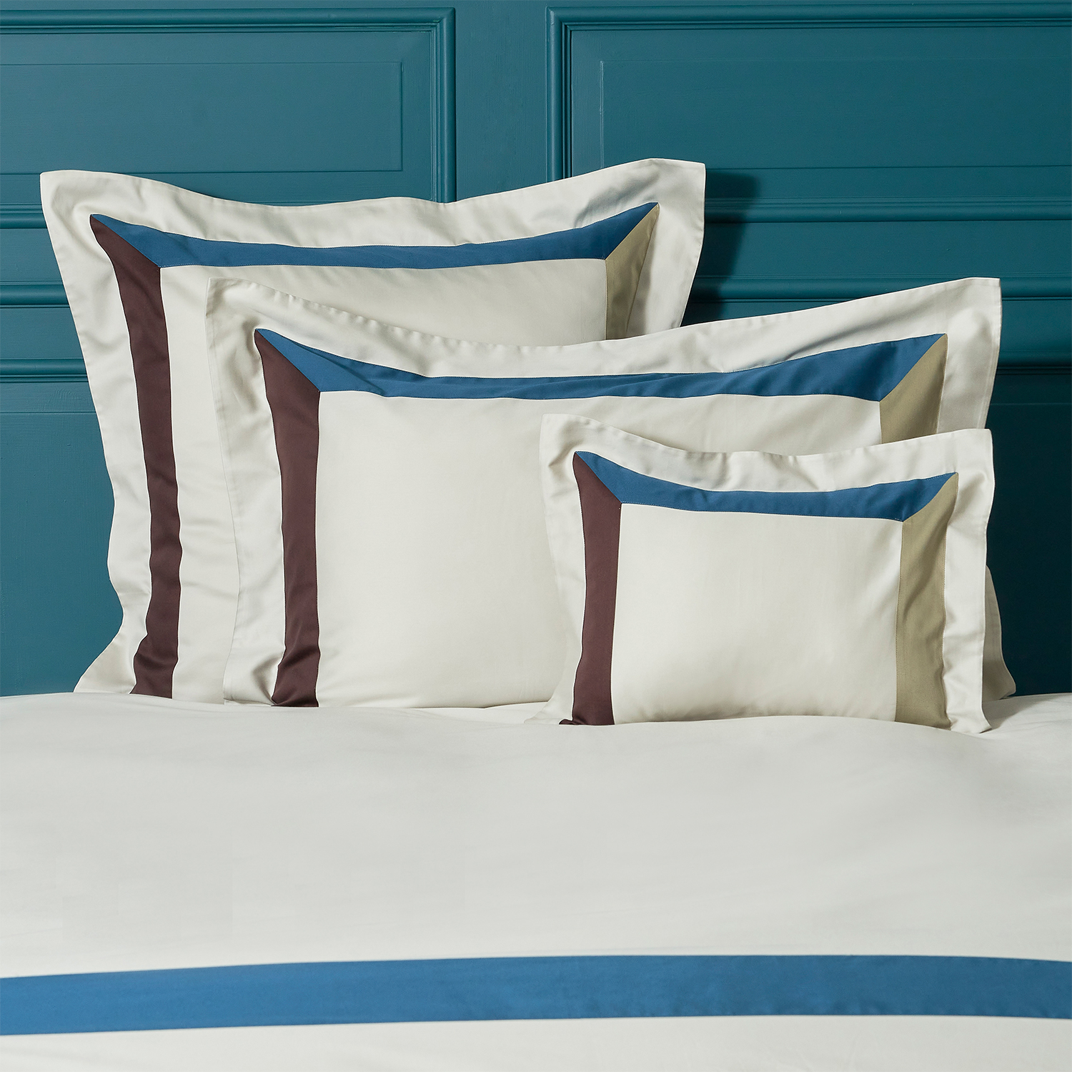 The SPAZIO collection is inspired by three-dimensional aspects of design. Three panels of sateen cotton have been dyed using centuries old Italian techniques to ensure that the three contrasting bold colors will not fade even after multiple washes. The three panels are expertly sewn into the solid base arranged in a “U” shape to create a modern, clean look.