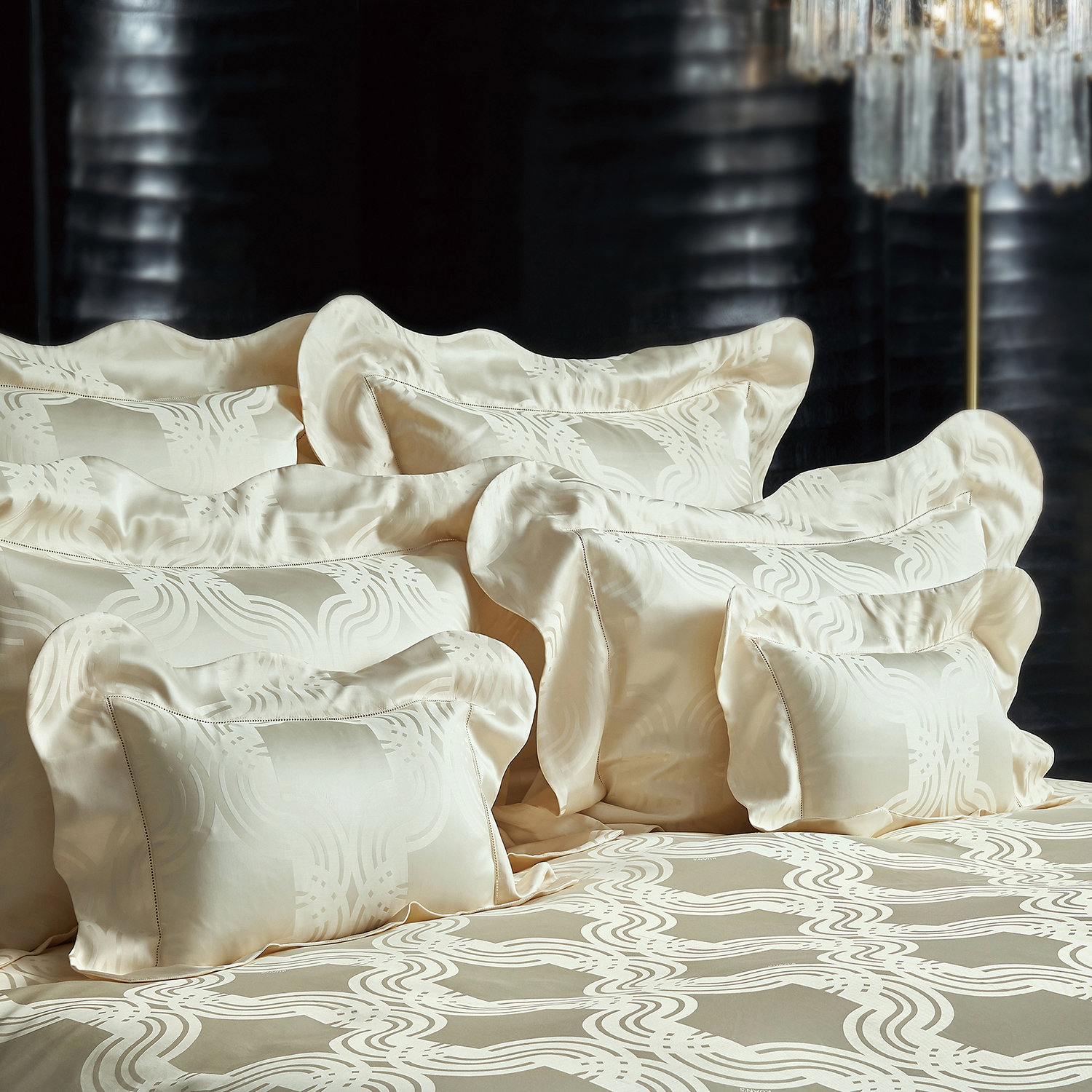 The CESARE GIZA45 collection features a tone-on-tone design inspired by the intricate and ornate designs of historic Italianate window grills. Presented in our soft and luxurious GIZA 45 Egyptian extra-long-staple cotton, the CESARE GIZA45 collection highlights the skill of our craftspeople in Italy with hand tailored scalloped edges and precise single Anjou stitching.