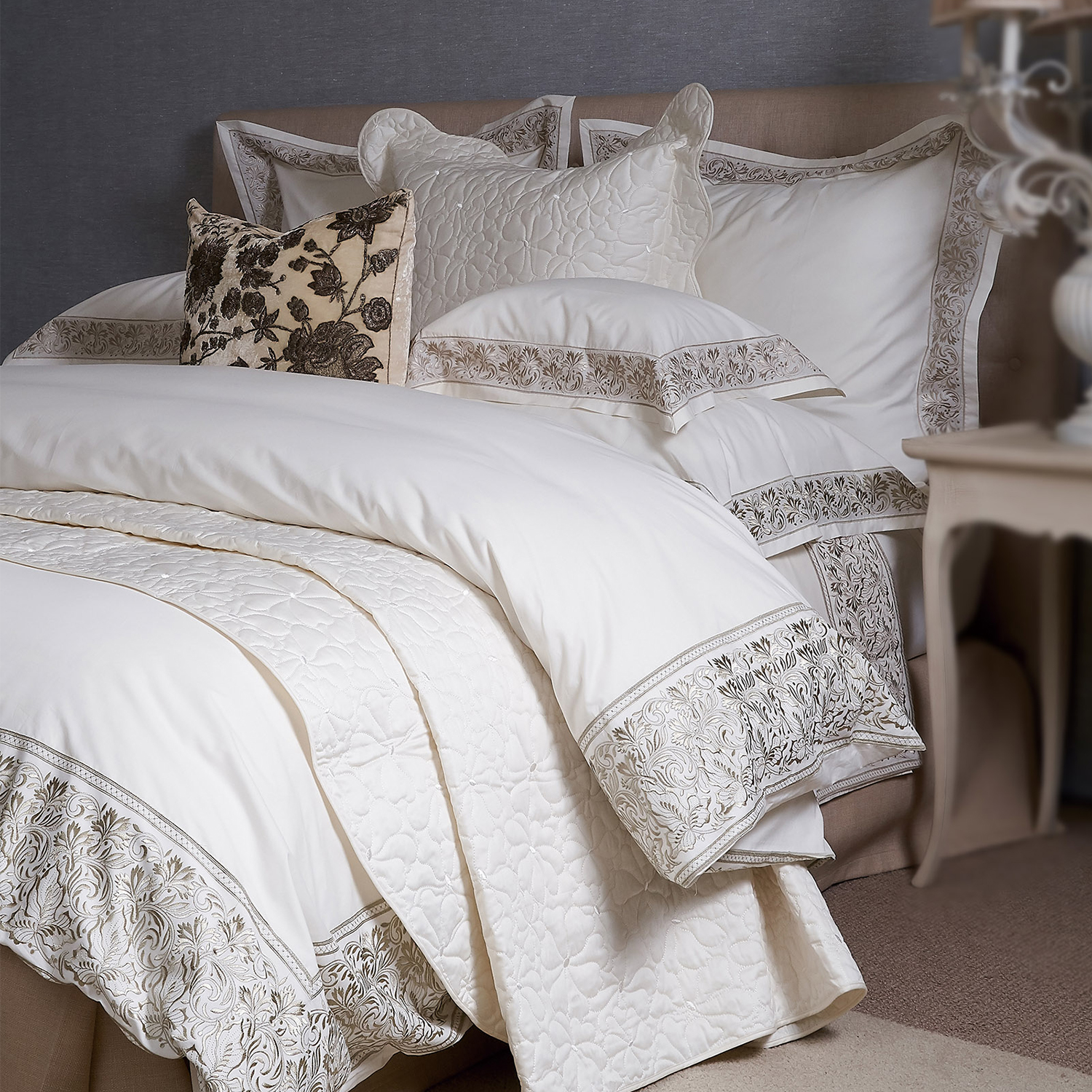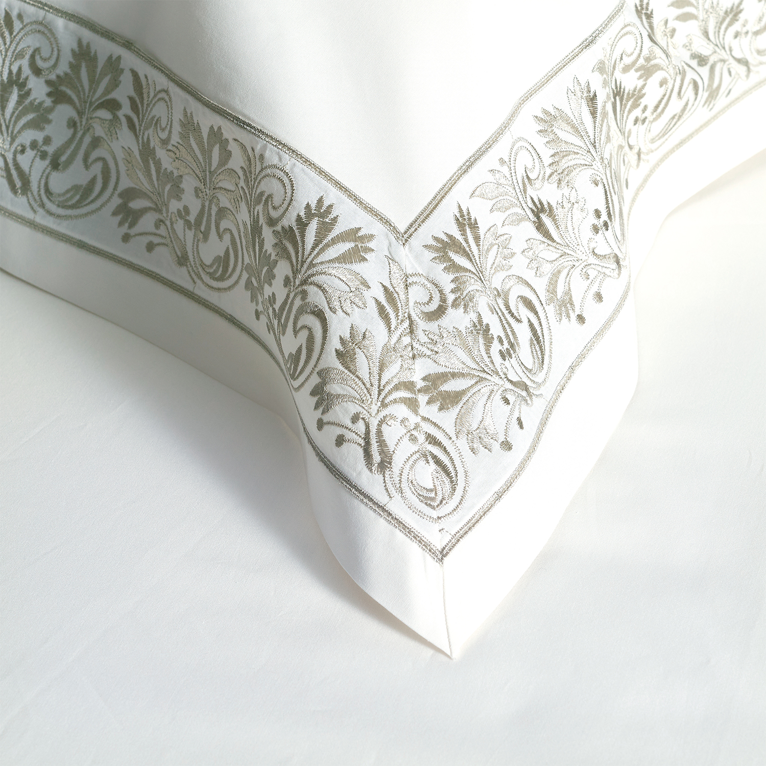 The EUTERPE collection features an exquisite lace decoration inspired by the “Rococo” artistic movement. Our exclusive lace design is embroidered onto a fine muslin base. The lace is then paired with our ANGEL SKIN®, GIZA Egyptian cotton percale to create a durable bed linen which is exceptionally breathable and soft to the touch.